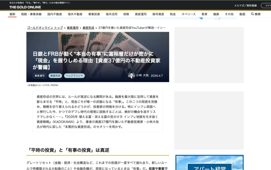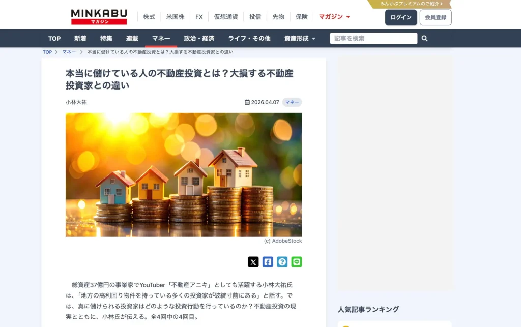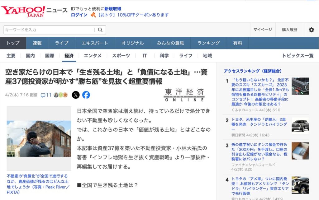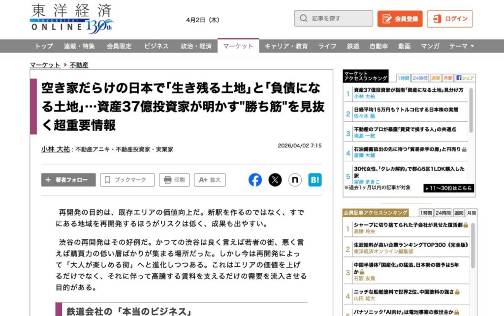 【2026年4月2日】日本最大級のビジネスニュースサイト・東洋経済オンラインにて、当社代表・小林大祐による寄稿記事「空き家だらけの日本で「生き残る土地」と「負債になる土地」…資産37億投資家が明かす"勝ち筋"を見抜く超重要情報」が掲載されました。