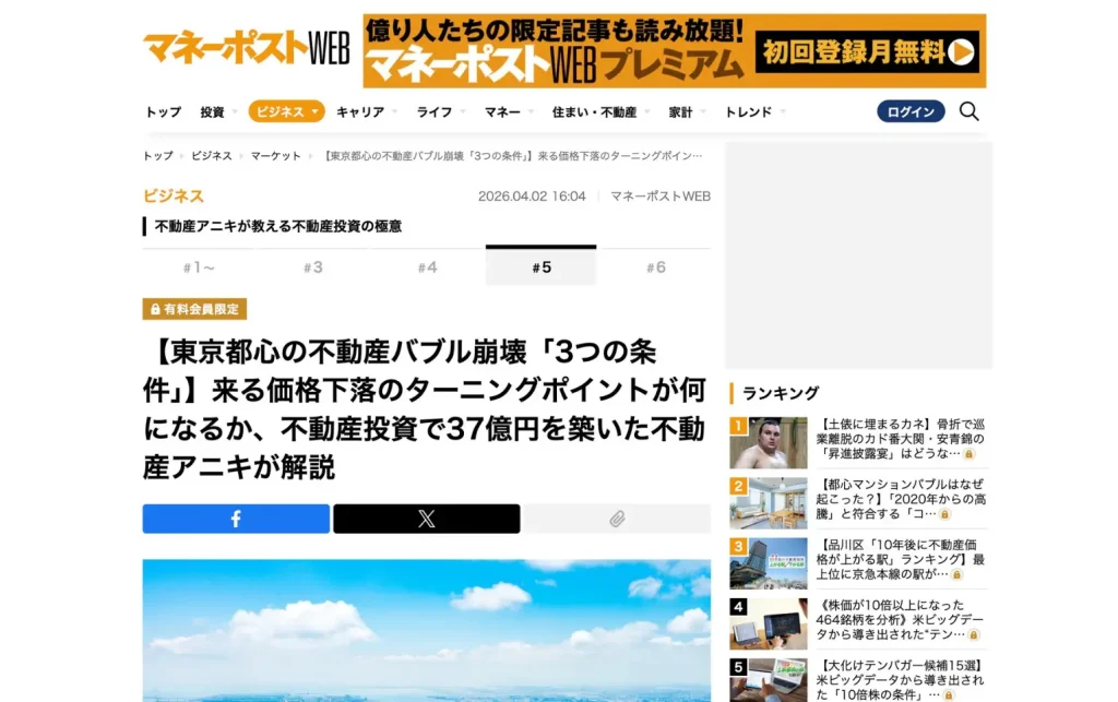 【2026年3月26日】東洋経済オンラインにて、代表・小林大祐の記事が掲載されました。記事の中で、東京の不動産価格が下落に転じる可能性について独自の視点で分析。価格崩壊のトリガーとなりうる"3つのシグナル"を具体的に解説しています。