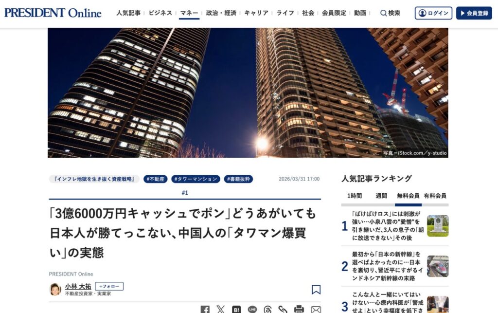【2026年3月31日】ビジネス誌「PRESIDENT」の総合情報サイト・プレジデントオンラインにて、当社代表取締役社長・小林大祐の記事『3億6000万円キャッシュでポン」どうあがいても日本人が勝てっこない、中国人の「タワマン爆買い」の実態』が掲載されました。