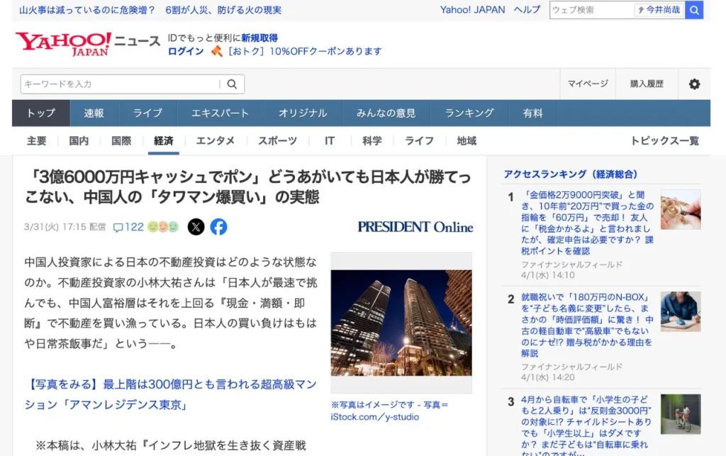 【2026年3月31日】プレジデントオンラインに掲載された当社代表・小林大祐の記事『3億6000万円キャッシュでポン」どうあがいても日本人が勝てっこない、中国人の「タワマン爆買い」の実態』がYahoo!ニュース (2026年3月31日(木)17:15 配信)に取り上げられました。